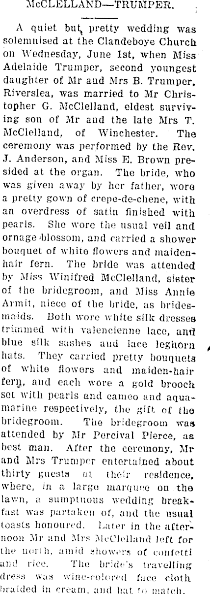 1st Jun 1921: Christopher and Adelaide McClelland