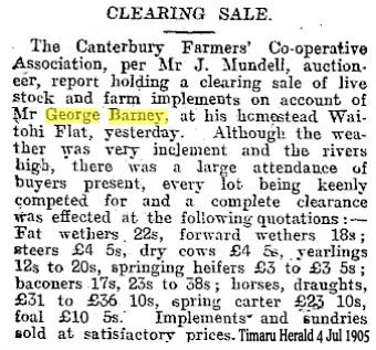 Immigration: George (24Y) occ: farm labourer along with wife Emily (22Y) and their 1yr old daughter Ellen left from Plymouth, England on 25 Sept. 1874 on the "Crusader" (1058 tons, Captain: Renaut, Surgeon Superintendent: Dr John Guthrie) They arrived in Lyttelton , NZ on 31 Dec. 1874 29 Apr 1897: George elected to Rangitata School Committee (47 children on the roll) May 1896: G Barney calls tenders for farm at Orari "TENDERS are invited for the GOOD WILL OF LEASE OF 236 ACRES, part of Education Reserve 1400, Newlands, Orari, now occupied by the Undersigned, 26 Acres are in Turnips, 6 Acres Swedes, 20 Acres Rape, the balance in Grass and Stubble. The Lease has 12 Years to run. Good Six-Roomed House, Shed, and Sheep Yards, Fences in good order. No tender necessarily accepted. Tenders to be left before MAY 20th, with MR T. BUXTON, Temuka, Or G. BARNEY, On the Farm. 11 Mar 1902: Applications for patent: G Barney, Waitohi Flat; improvement in ploughs