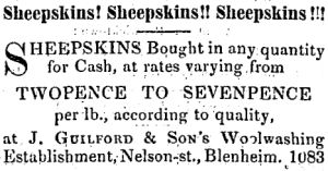 Marlborough Express, 1868: Cleared outwards Nov 19 "Falcon", ketch. 37 tons, Capt Cracknel for Wellington, with the following cargo: 15 Bales wool, Guilford; Daily Southern Cross, 3 May 1869: Mr. Warren, the owner of the Birch Hill estate, Marlborough, has determined to improve the yield and quantity of wool by a judicious culling of his flocks, and by introducing new blood. Mr. Guilford has purchased upwards of 3,000 head for their skins alone, at the very nominal rate of one shilling each. Evening Post, 4 January 1869: WOOL. THE Highest Price given for Greasy Wool and Sheep Skins. Cash on delivery. JAMES GUILFORD, Kai-Warra Warra. Evening Post, 1 June 1871: THE undersigned is a CASH buyer of Wool, Skins, Locks, and Pieces. JAMES GUILFORD, Kai-warra. (This advertisement repeated throughout the month) Wairarapa Standard, 27 July 1872; HIDES AND SKINS BOUGHT. THE highest price given on delivery at Kaiwarra, Wellington. J. GUILFORD Evening Star, 4 Dec 1872: TO CAPITALISTS; TO BE SOLD, a valuable Plot of LAND, containing Two-and-a-half Acres (more or less), in the Town of Blenheim, together with all Buildings and improvements thereon. The premises are now in the occupation of J. Guilford and Son, Wool Staplers and Fellmongers, and comprise a new and commodious Dwelling-house, with Garden and Out offices, a Wool-shed, Sweating-house, Pulling-shed, Washing-tank and Pits, with every convenience for carrying on a large and lucrative business. A never-failing stream of soft and pure water runs through the Property, the which is securely fenced. The terminus of the Blenheim and Picton Railway will be within five minutes walk of the line, a portion of the line running along one side of the property. Private circumstances rendering it necessary for the present owner to leave the Province, is the only reason far offering it for sale. THE GOODWILL OF THE BUSINESS, which has been steadily increasing under the management of the proprietor for the last five years, will go with the property. There is a first rate opportunity for adding the Tannery Business to the above, as there is not at present any practical competition. Principals only will be treated with. Address: JAMES GUILFORD & SON, BLENHEIM. Marlborough Express, 12 March 1873; Blenheim Borough Council. SLAUGHTER-HOUSE. Mr J. Guilford applied for a license to slaughter at his yard on Mr McCollum's section, at the bottom of Nelson-street. Cr Hodson proposed, and Cr Robinson seconded a motion, that the application be granted. Cr Dodson had no objection to granting the license, but suggested the desirability of having a report from the Inspector of Nuisances as to the eligibility of the place also, to prevent the pollution of the Omaka river by the drainage from the slaughterhouse. The resolution, by the consent of the mover, was then amended to the effect "That the license be granted, subject to the approval of the Inspector of Nuisances." Marlborough Express, 21 June 1873: Notice. THE BUSINESS of Mr. James Guilford will be CARRIED ON AS USUAL, during his temporary absence, by Mrs. Guilford. Question - did Rebecca and James separate??? Evening Post, 15 Sept 1873; CENTRAL BOARD OF HEALTH Notice: Applications having been made to the Board for leave to erect slaughter yards as under, all parties objecting to the same must send in notice of such objection to the undersigned not later than the 19th inst on which day a meeting of .the Board of Health will be held at half past 10 o'clock, for the purpose of considering said applications, all parties interested being expected to attend � �James Gear-Slaughter House and boiling down establishment, at Sellars', Petone; James Guilford� Slaughter yard, No 4 section, half mile from Kaiwarra , ,200 yards from main road; CHARLES C, GRAHAM, -. Secretary, Provincial Buildings, Wellington, 12th Sept,, 1873, Evening Post, 8 Oct 1873: The following; id the result of the poll, taken yesterday, for the election of five persons as a Board of Commissioners for the Kai-warra-warra district: W. T. Whyatt, 25; G. Reynolds, 24: E. M. Taylor, 22; J. Guilford, 21; J Holmes, 16; D. Calders, 15. The first five are therefore the commissioners. 16 Jan 1874 - J Guilford - Application for reserve on North Road 1874 Daily Southern Cross, 14 October 1874: NOTICE TO MERCHANTS, SETTLERS, FARMERS, AND OTHERS The undersigned Is prepared to Sort, Scour, Dry Pack, and Deliver Wool, fit for shipment, on reasonable terms Shippers of Wool in grease will find It from 5 to 10 per cent , and in some wools more than that amount to their Interest by having their wool shipped in good order and condition, instead of shipping it various sorts mixed together, and In grease; The Highest Market rates given for Wool, Sheepskins, Locks, Pieces, and Chippings CASH ON DELIVERY. JAMES GUILFORD, WOOL - SCOURING ESTABLISHMENT, Whau, near Auckland.Daily Southern Cross, 1874: EXPORTS: Port of Onehunga: Nov 20. Per Ferndale, for London - 25 bales wool, J. Guilford West Coast Times, 9 Jan 1875: A Tanning and Leather Manufacturing Company is projected in Wellington, and in fact is almost floated. The directory is strong and influential. The proposed capital is �20,000, in �5 shares, with power to increase it to �50,000. The company have arranged to buy the business of Mr Guilford, extend it by means of capital, and go largely into the export trade in leather. Marlborough Express, 15 May 1875, Mrs. Guilford, DRESSMAKER, &c, HOPE COTTAGE, GROVE ROAD. Children's Clothing made, and Plain Needle Work done. Marlborough Express, 4 September 1875, Page