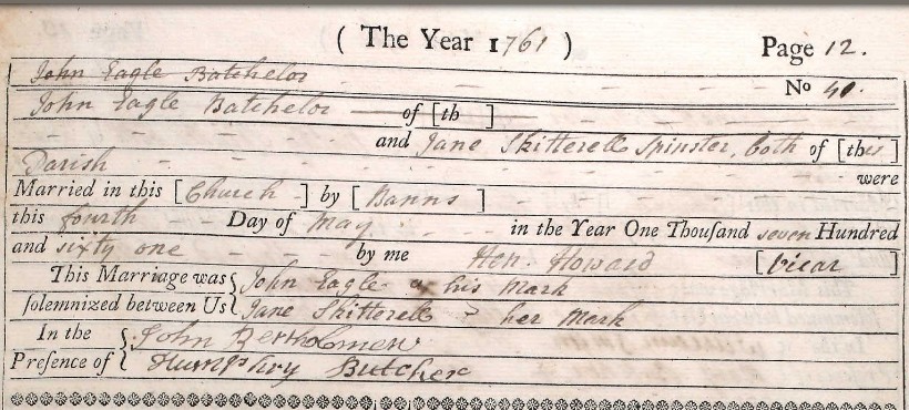 1761 in Church of England, Burbage Wiltshire to John Eagle (b: 08 Jun 1740 in Great Bedwyn, Wiltshire, England