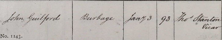 John d: at Burbage aged 93Y and was bur: 3 Jan 1855 at the Burbage Parish Church. JOHN GUILFORD, occ: labourer, mar: 18 Jun