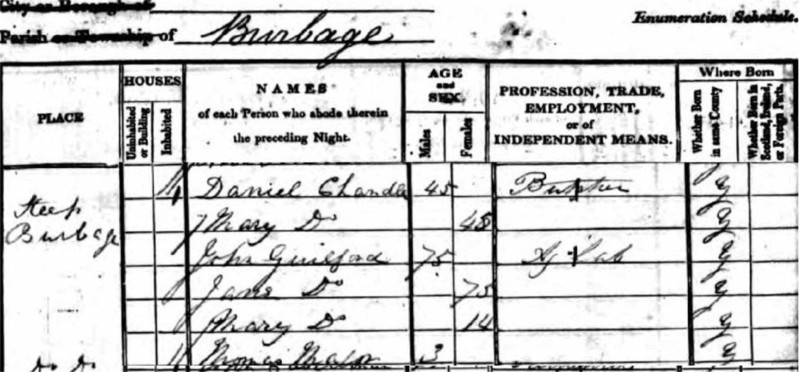 Daniel's family: b:of Sister Ann Chandler(1796–) Burbage; b: of Sister Mary Chandler(1798–) Burbage; d: of Brother Walter Chandler(1788–1798) Burbage; b: of Sister Elizabeth Chandler(1800–) Burbage; d: of Father William Chandler(1752–1834)