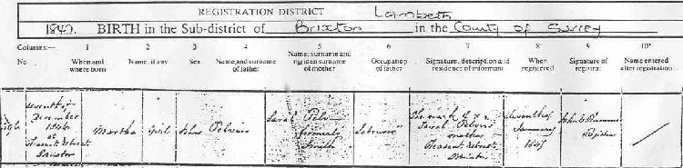 Pelvin (b 7 Dec 1846 in 6 Pleasant Retreat, Brixton, Surrey.(Informant