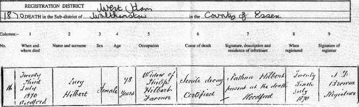 Lucy Pelvin b: Oct 1792 in Boxley, Kent to parents Peter Pilven (Pelvin) and Lydia nee Latter; She was Bapt: 04 Nov 1792 Boxley, Kent; 10.10.1843 - she registered the death of her mother, Lydia (nee Latter); Her own demise on 23 Jul 1870 aged 78 yrs was in Woodford, Walthamstow, Essex and was registered by son Nathan Hilbert who was present at her death - shown as "Widow of Philip Hilbert, a Farmer"; Bur: 26 Jul 1870
