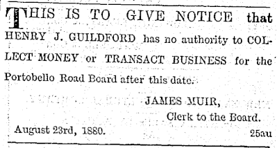 Aug 1880: H. J. Guildford, clerk to the Portobello Road Board, was
