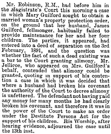 When the case of James Guilford v Mary Guilford and George Wilkins, was heard eventually at court, James Guilford, the petitioner did not intend to proceed in the matter. Mr. Wilford appeared for the corespondent. Mr. Izard gave Notice that he would apply for a dissolution of marriage on the ground that the wife had been deserted, and the case was then adjourned until Monday.